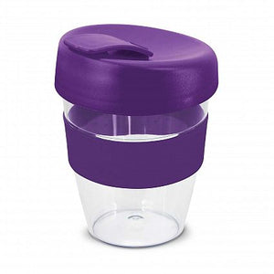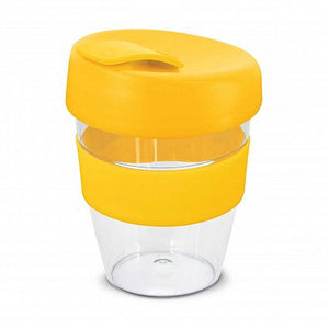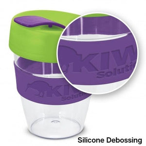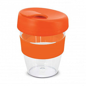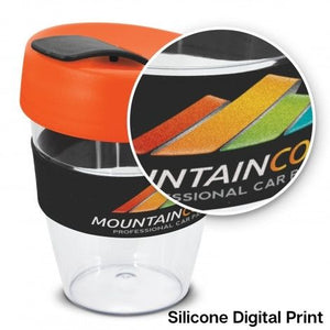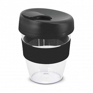 Crystal clear, 350ml reusable coffee cup with a heat resistant silicone band and a secure screw on lid which features a splash proof flip closure.