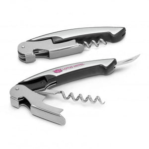 A smart wine waiter's knife with a corkscrew, a bottle opener and a foil cutter. It laser engraves to an oxidised white colour.