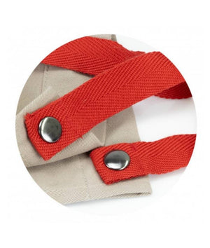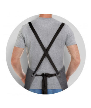 Fashion inspired 280gsm cotton bib apron with a medium pocket on the front and gunmetal rivets. It has interchangeable coloured cotton straps which cross over at the back for an adjustable fit. The straps feature a gunmetal dome for easy removal of straps.