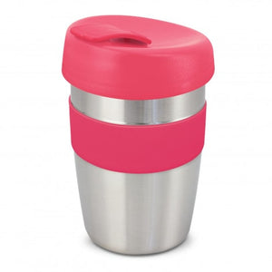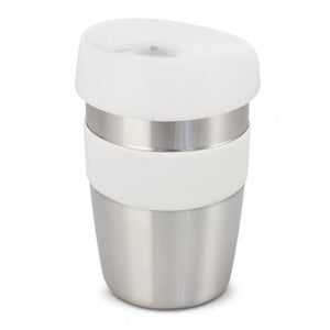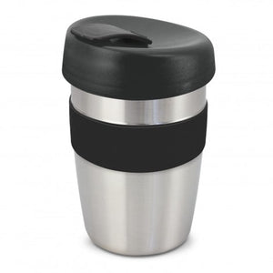 Design inspired 350ml double wall reusable coffee cup which will keep drinks hot for longer and remain cool to hold. It has a heat-resistant silicone band and a secure screw on lid with a splashproof flip closure.