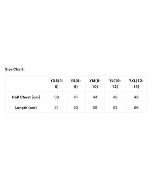 Y-XS(Age 4 to 6), Y-S(Age 6-8), Y-M(Age 8-10), Y-L(10-12), Y-XL(Age 12-14)