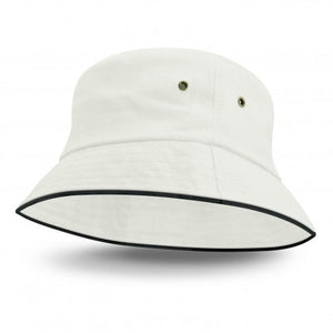 Premium heavy brushed cotton bucket hat with stylish black sandwich trim around the base. It has a sweat band and is available in three sizes.