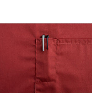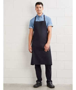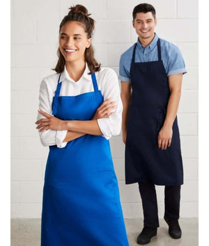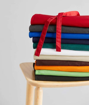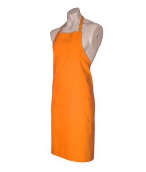Popular bib apron with adjustable halter self fabric strap around neck, with towel loop.