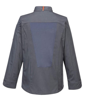 This chefs jacket uses a lightweight fabric and offers a modern, slimmer silhouette with an ergonomic fit.