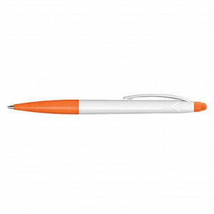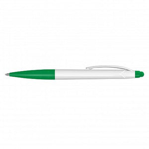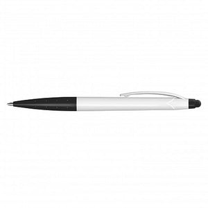 Twist action plastic ball pen with a white barrel and a stylus for use with touch screens. It has a black refill with 500 metres of writing ink and a tungsten carbide ball for improved writing quality.