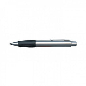 Retractable plastic ball pen with a soft rubber grip, a metallic barrel and metallic silver trim.