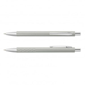 Retractable aluminium ball pen with a debossed pattern on the grip, a matt lacquered barrel and shiny chrome accents. It has a blue large volume refill with 800 metres of writing ink and laser engraves to an oxidised white colour.