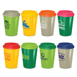 350ml double wall reusable coffee cup with a secure screw on lid which will keep drinks hot for longer and remain comfortable to hold. It is manufactured from polypropylene which is shatterproof, odour-resistant and BPA-free. The cup and lid can be mixed and matched in any colour combination from the colour palette at no extra cost. Up to five different colour combinations are included in the price and more are available for an additional charge. An optional black gift box is available on request. This product is not dishwasher safe and handwashing is recommended.