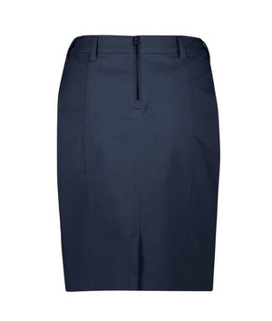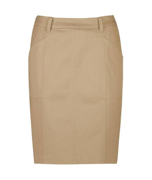 A modern Chino skirt featuring functional back split, non-gaping side seam pockets, metallic back zip feature, belt loops and modern trims. Pencil shape designed to finish mid length, but will vary depending on wearers height. Detachable belt included. Fabric has added stretch for comfort and easy movement