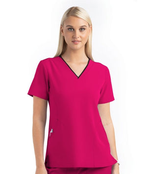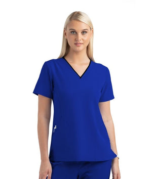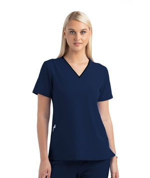 Women’s V-neck top with contrast/dyed-to-match neckband and decorative contrast stitching