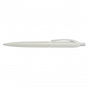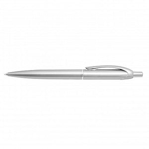 Retractable plastic and metal ball pen with a metallic barrel and shiny chrome accents.